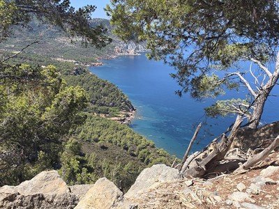 (Mallorca) En la Sierra de Tramuntana. Destaca el senderismo por el «Camí des Correu». Los miradores ofrecen vistas técnicas sobre los bancales de piedra en seco (Patrimonio de la Humanidad). Paisaje de encinar, algarrobos y relieve de montaña caliza.