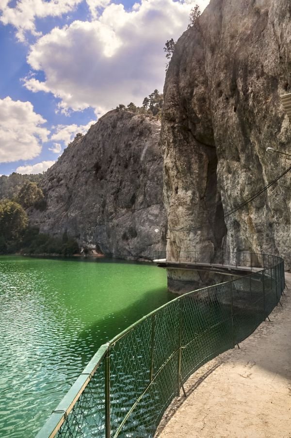 En la Serranía de Cuenca, confluencia del Cuervo y el Guadiela. El senderismo ofrece miradores sobre la Hoz de Beteta. Paisaje de roca caliza vertical, aguas turquesas y densos bosques de pino laricio en un relieve kárstico severo.